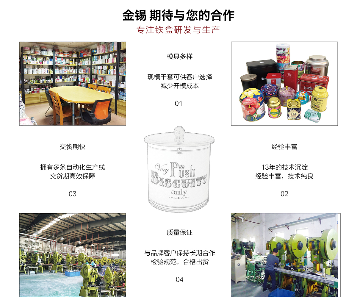 廣州市金錫五金制品有限公司成立于2016年,是已有13年生產經驗的實力廠家。我廠是專業(yè)定制優(yōu)良馬口鐵盒、鐵罐、禮品盒、茶葉罐、月餅盒等金屬鐵盒包裝的制罐企業(yè),我們擁有超過6000平方米的標準現(xiàn)代化廠房及八條生產線。公司集產品研發(fā)、設計、生產、銷售于一體,技術優(yōu)良,實力雄厚。通過十多年的制罐經驗,我們擁有專業(yè)的技術團隊,嚴格的作業(yè)流程、完整的品質保障體系、完善的銷售以及售后服務系統(tǒng)。